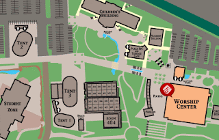 The building labeled “Worship Center” on this map seats upwards of 4,000 people.