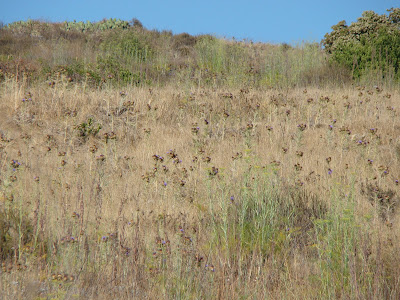 Having in mind a post about wild artichokes, I resolved to take pictures. I had spotted two wild artichoke plants in bloom. Both plants were on the narrow, winding, shoulderless road that leads into our rural canyon. Stopping to take photos would be dangerous. Last Friday, when Rich and I were on our way out for an early dinner date, I grabbed our camera and described to him where I wanted to stop to photograph artichokes. I figured he could stop long enough for me to get out of the car, then find a safe place to turn around and return for me.
