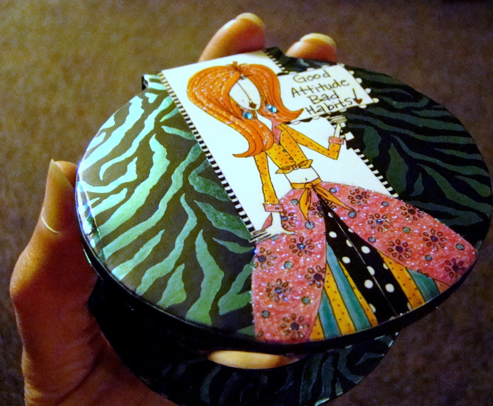 Inside the store I found a pocket mirror. Covered in a teal and black metallic zebra print, it bore a fanciful image of a woman. Dressed in an ensemble of polka dots, stripes and a floral print, she sported big flashy earrings. Her red mane obscured her right eye. Her blouse was tied about her waist, exposing her belly button. I would never dress in such a manner–but I could carry this whimsical fashionista in my purse.