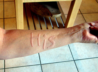 As for the distinguishing mark, it’s called “dermatographia.” Twice now, following surgery, I’ve developed this condition. In 2008 it persisted for 3 months. This time we’re just past the six-month mark. It’s a weird kind of pressure-induced hives: