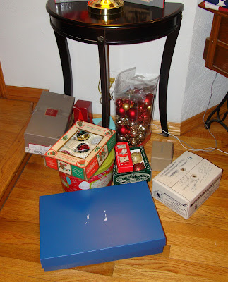 Once I’d removed, wrapped, and tucked the ornaments into boxes, It was time to pack them away. The new bins will hold our room decor, things like stocking hangers and the trees Rich’s children made, many Christmases ago. The ornaments, tree skirt, angel-on-top and tree lights will go into my tin tea chest.