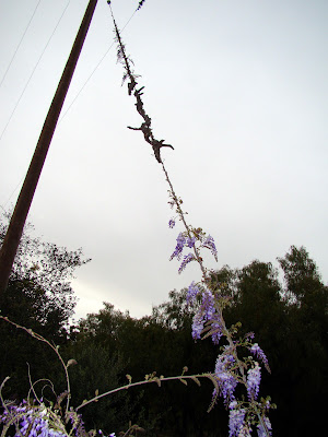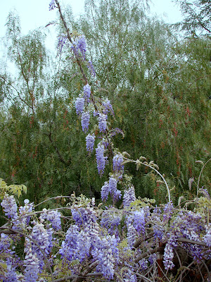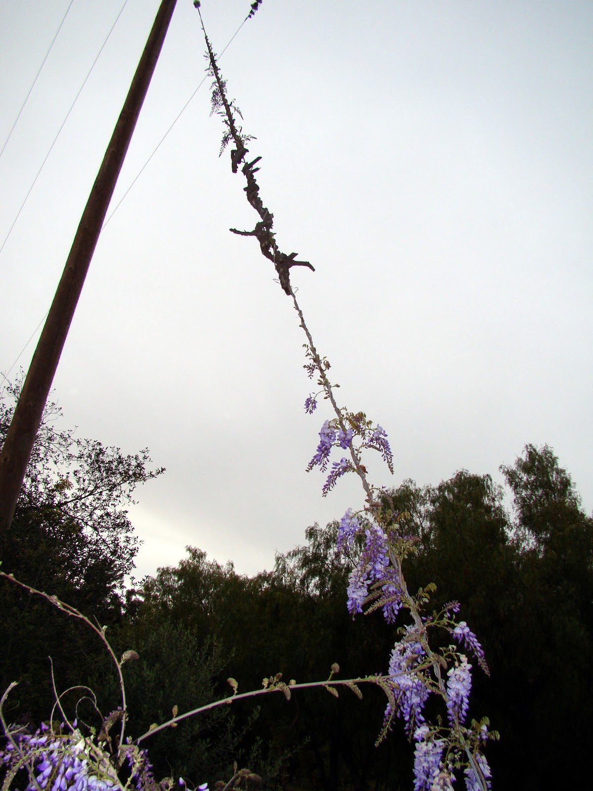 After I nearly missed the plum flowers, I made wisteria my priority. Our neighbor, down at the corner of the main road, grows wisteria along the fence line protecting the orchards from the deer, and whatever else threatens orchards. It is abloom now, the wisteria, which grows only to sashay along a fence line.