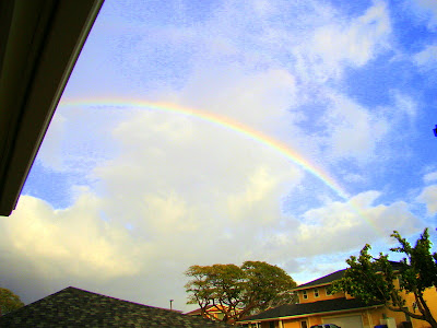 “Come out on the porch and look left. There’s a magnificent rainbow.” My daughter has called me just an instant after leaving to pick up her husband. We’re visiting them in Hawai’i, and toddler Sawyer is asleep. Rich and I stay home with Cadence while his mommy goes to collect her husband from the shipyard where his submarine is in for overhaul.